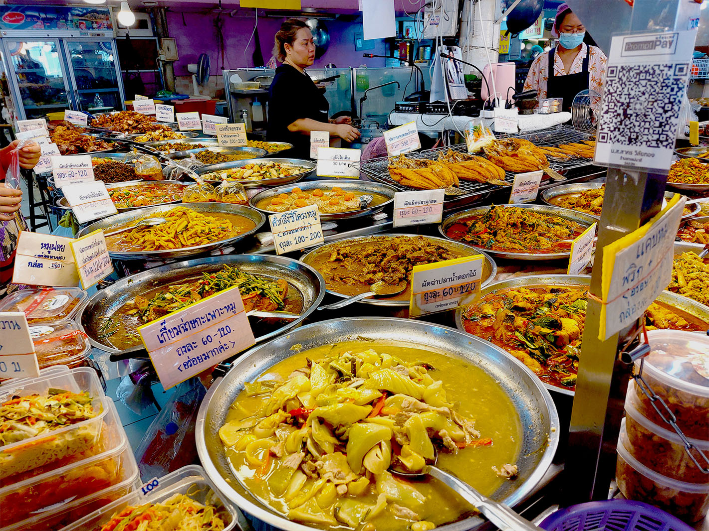 這裡的商品選擇豐富,從35 泰銖一袋、還獲得米其林推薦的炸香蕉(กล้วยแขกพระราม 5),到最頂級、每公斤高達 12,000 泰銖的榴槤,全部應有盡有;還能品嚐到現烤海鮮、剝好殼的蟹腳、青木瓜沙拉、切好的鮮果盤,以及各式泰式傳統甜點,滿足不同客群的需求。
