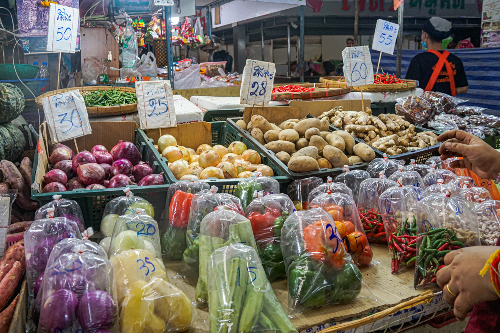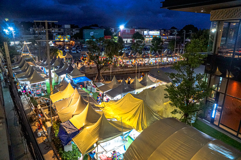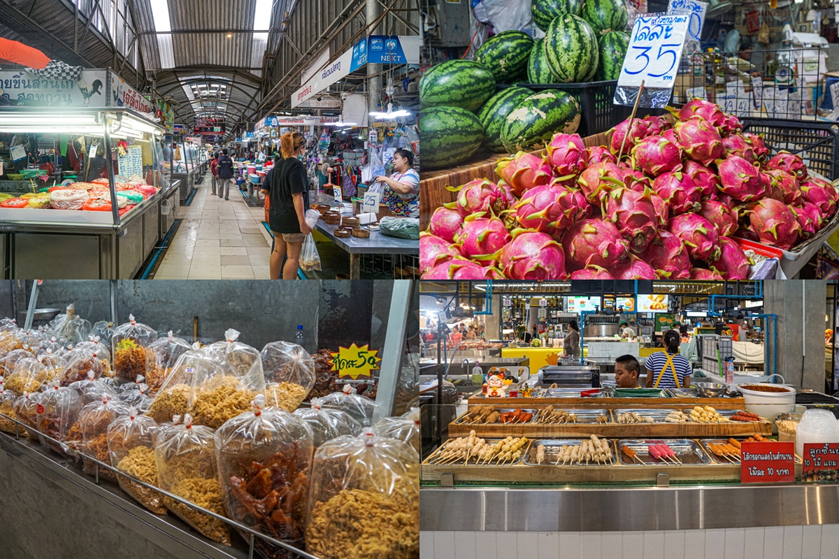 市場的特色在於幾乎全天候都能逛(雖然不是所有攤位 24 小時營業)。白天,這裡是採買新鮮、價格實惠的蔬菜水果、肉品與熟食點心的好地方,還能順便逛室內百貨;傍晚時分,搖身一變成為熱鬧夜市,在點燈的河岸座位,隨意就能享用當地人的日常美食:一支 25 泰銖的巨無霸東北香腸、一盒 20 泰銖的泰式甜點或炒麵……價格親民又充滿生活感。