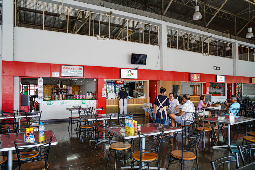 市場共有兩層樓,乾淨整齊,沒有傳統市場的雜味。一樓以生鮮水果、鮮花、熟食小點為主,也設有零散座位可邊買邊吃,偶爾還能見到按摩店;二樓則規劃為泰式美食餐廳區,座位寬敞,但用餐人潮並不多,反倒是一樓室外的熟食攤位更受在地人青睞。