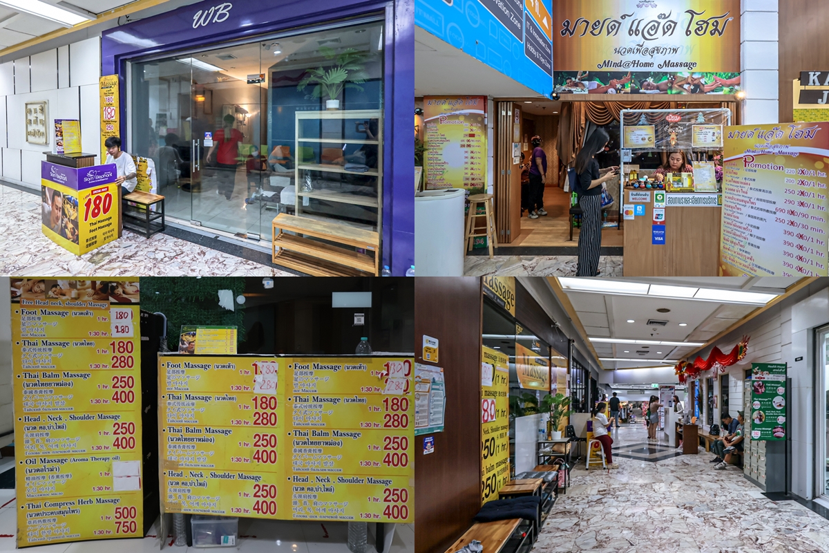 這條按摩街之所以鮮為人知,主要是因為它位於 Fortune Town 商場地下一樓,裡面有點像泰版的光華商場,販售各式電腦、攝影及音響設備、手機周邊、黑膠唱片等,一般遊客較少光顧,因此客群多是以當地人為主。