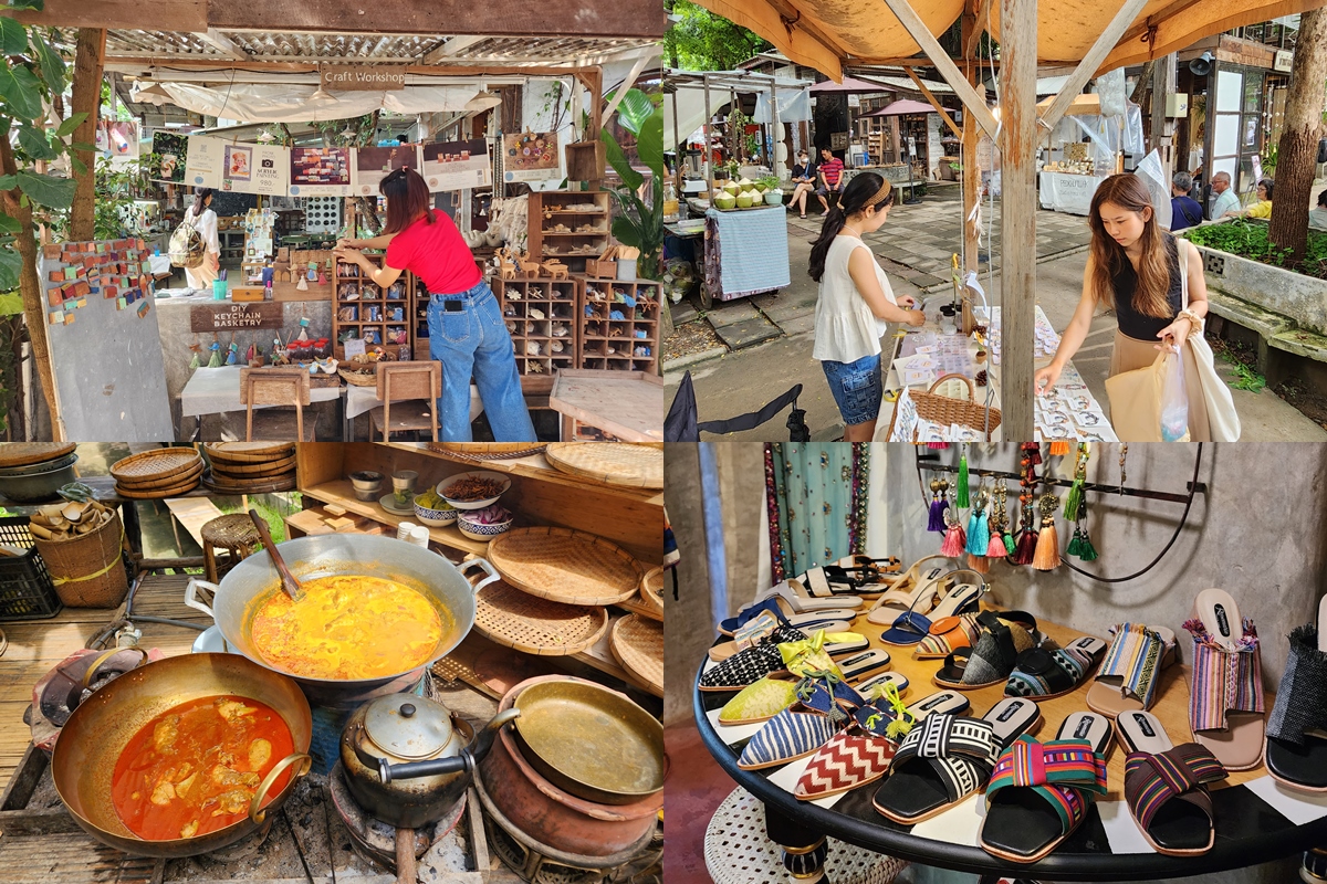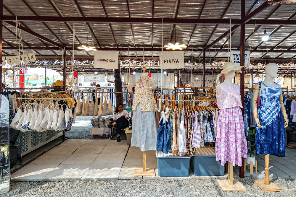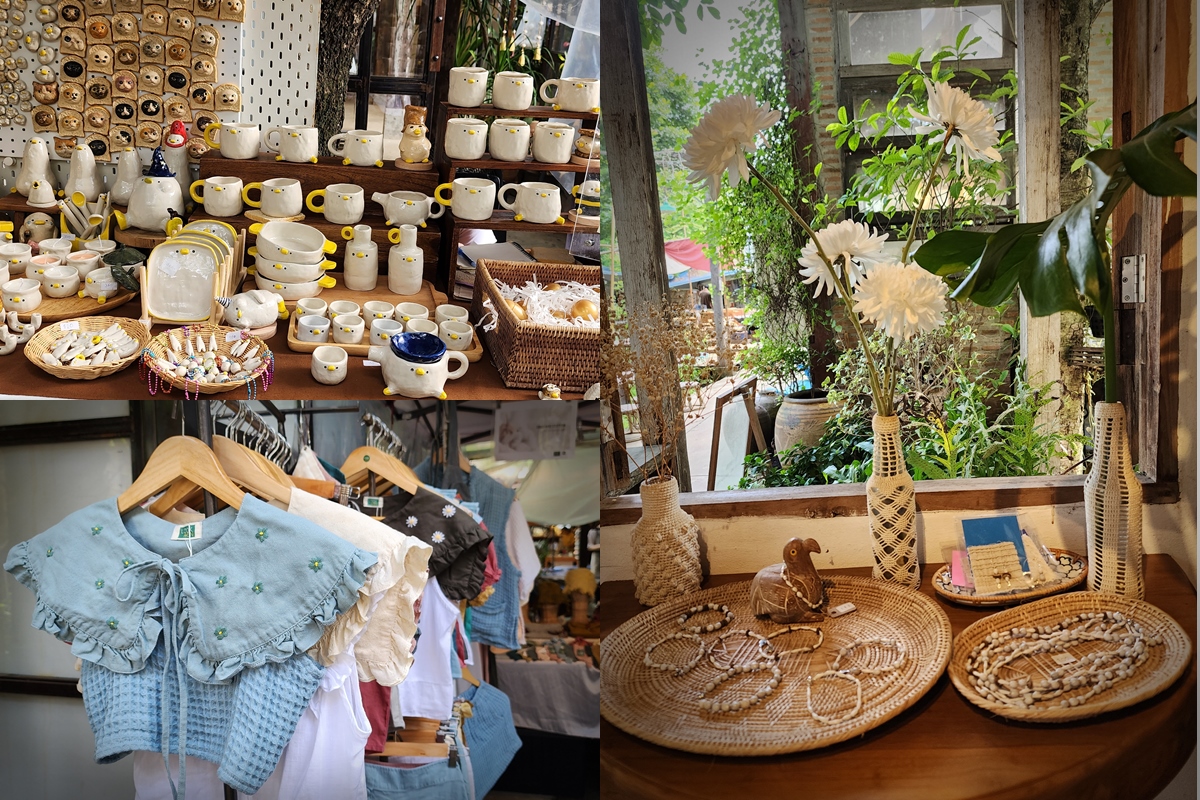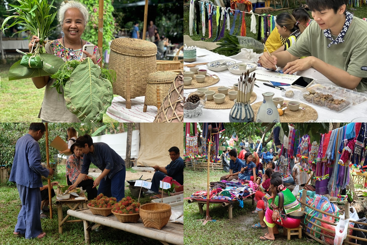 市集聚集了來自在地族群與小農職人的手作選品,包括克倫族織品、手染棉麻服飾、藤編工藝、蜂蠟布、純素食品、友善環境的護膚品與永續日用品等。就連商品包裝都十分用心,有以樹葉編成的手提袋,甚至也有直接用大片荷葉盛裝的餐點,從細節就能感受到對自然的尊重。