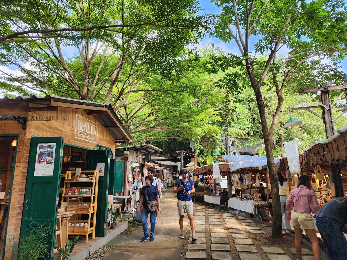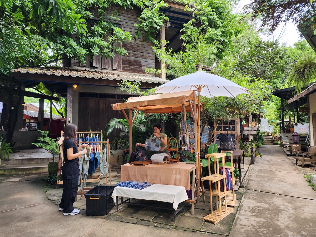 Baan Kang Wat,意為「寺廟旁的聚落」(就位在 Wat Ram Poeng 對面),園區內保留半木造、半混凝土的建築風格。每一棟小屋都是藝術家親自經營的小店,從手工圖書店、畫廊、香氛品牌,到服裝飾品、咖啡廳、冰淇淋店、家居選物,還有不定期的現場活動與假日表演,讓整個市集充滿生活感與藝術氣息。