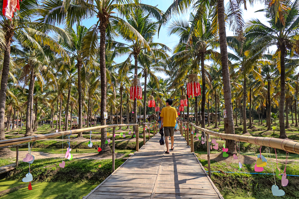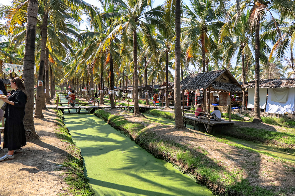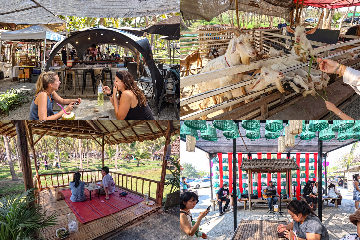 市集攤位沿著大片椰林與水道設置,竹製涼亭架在翠綠溝渠上,陽光灑落、綠意閃動,不少人選擇坐下來喝杯咖啡、聽音樂,甚至直接躺平發呆,享受最愜意的「清邁式放空」。