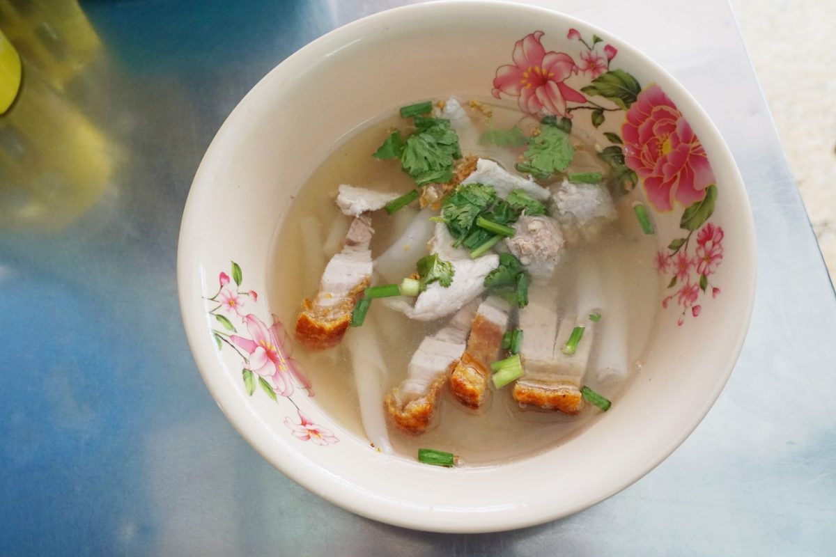 也真的不得不說,在泰國通常最讓人回味無窮的美味小吃,總是在那不起眼的路邊小店裡,像這間主打胡椒清湯湯頭的無名粿雜店,裡面配料就很豐富,有超 Q 彈香滑的粿片跟好吃又不油膩的脆皮燒肉(這個大推,真的超級好吃),還有新鮮乾淨又有口感的豬內臟(不吃內臟類的可不加)。